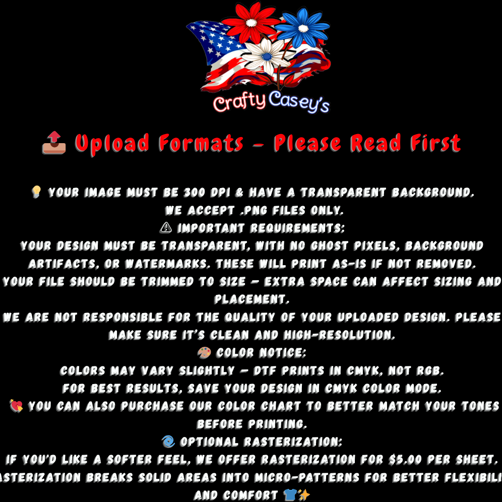 💡♀️Note: We are not responsible for how you line up your gang sheet. We are also not responsible for your colors. As digitally on a computer the colors will never match up completely. DTF is printed in CMYK, not RGB as for computers. We do our best to get them as close as possible. 💡